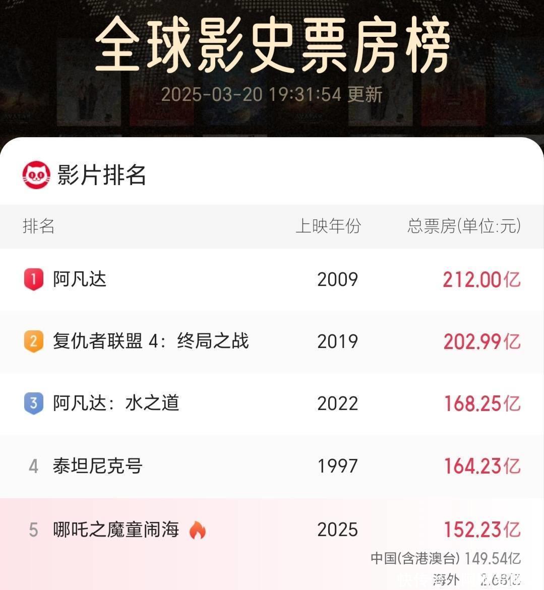 甘休现在,《哪吒2》全球票房一经超152亿,位居全球影史票房榜第五,仅次于《阿凡达》(212亿),《复联4》(202.99亿),《阿凡达2》(168.25亿),《泰坦尼克号》(164.23亿)。