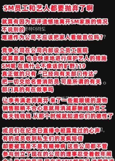 按照SM文娱职工的吐槽来看,咫尺的SM文娱完全钻到了钱眼里,完全即是只认钱不认东说念主,一朝赚不到粉丝的钱,就用降薪去威逼职工,搞得公司表里东说念主心惶遽,再加上处置层的更换,来了大宗的外部东说念主士,齐是新东说念主带新东说念主,说是我方心腹,说白了即是如今的SM文娱充满了关联户,那些处置层面的优秀东说念主才齐被排挤走了,懂得齐懂。