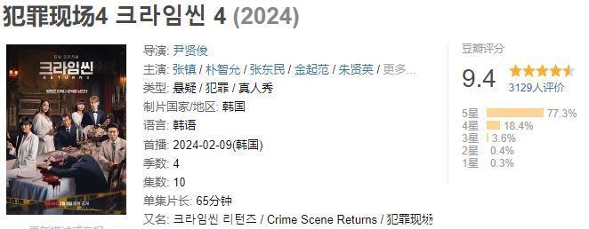 在豆瓣平台,《违警现场4》的最新评分约为9.4分,五星好评占比最高,约为77%。